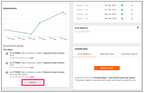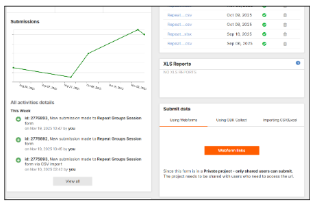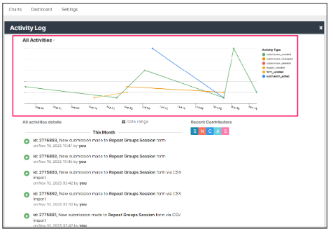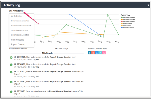 The activity log detail is a new functionality added to the Overview tab of a form. It provides project owners and collaborators with a clear view of all the activities that have taken place in a form. The Activity Log improves transparency, accountability, and monitoring by tracking submissions, edits, reviews, deletions, and form updates.