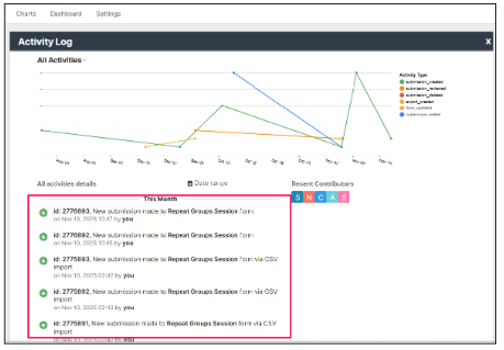 - Activity type: This includes submissions made, submissions reviewed, forms updated, and other relevant activities.